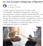 Never completely accepting that I have bipolar doesn’t mean that I don’t work hard to manage the illness daily. I work on this management despite my inability to calmly accept that this bipolar is in my brain for life.